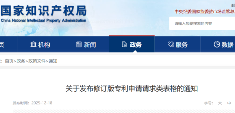 12月18日,国家知识产权局发布了关于发布修订版专利申请请求类表格的通知。其中提到,以上修订自2026年1月1日起启用,对应的旧版表格同时停止使用。本次修订不涉及客户端和电子申请数据标准规范调整。