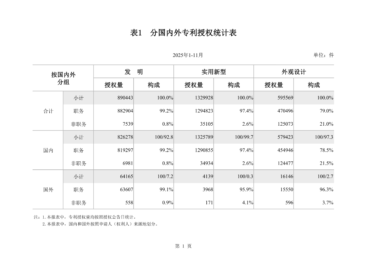 近日,国家知识产权局发布了2025年11月国家知识产权局审查注册登记统计月报。相较于2024年1-11月,2025年1-11月发明专利授权量同比减少8.38%,实用新型同比下降26.76%,外观设计增加3.42%。