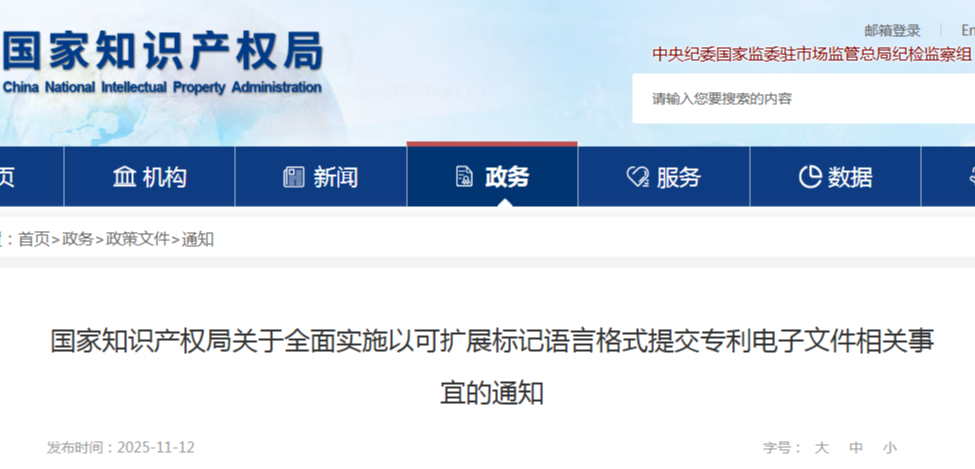 近日,国家知识产权局发布关于全面实施以可扩展标记语言格式提交专利电子文件相关事宜的通知。其中提到,自2026年1月1日(含当日)起,以电子形式办理专利申请、复审请求、无效宣告请求及相关手续的,应当以XML格式提交专利电子文件,国家知识产权局不再接受非XML格式的专利电子文件。